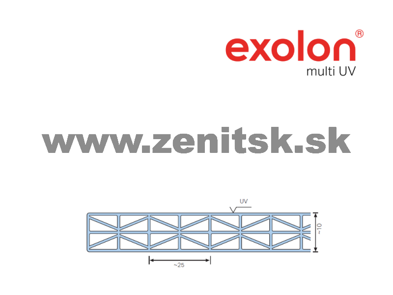 Exolon® 5X/10 je päťstenná polykarbonátová doska o hrúbke 10 mm. Kombinuje vysokú priepustnosť svetla, výbornú tepelnú izoláciu a dobrú únosnosť danú X-štruktúrou. Doska je ľahká, odolná proti nárazu a ľahko sa inštaluje.