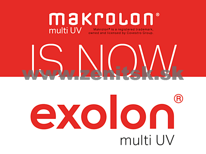 Výrobca polykarbonátových dosiek Makrolon® ukončil používanie tejto obchodnej značky a prešiel na obchodnú značku Exolon®. Čo zostáva, sú dosky samotné, so všetkým, pre čo sú na trhu polykarbonátových dosiek cenené. Mení sa len meno. Všetky súvisiace dokumenty ako certifikáty alebo produktové listy budú postupne redizajnované pre nové logo resp. obchodnú značku. Vzhľadom k základnému faktu, že sa mení iba meno, je možné vychádzať aj z aktuálnej dokumentácie. Z rovnakého dôvodu by nemal byť problém, ak v určitom okamihu od nás dostanete rovnaký produkt s dvoma rôznymi označeniami, a to na doskách (ochranná fólia) a na súvisiacich dokumentoch (dodací list, daňový doklad).