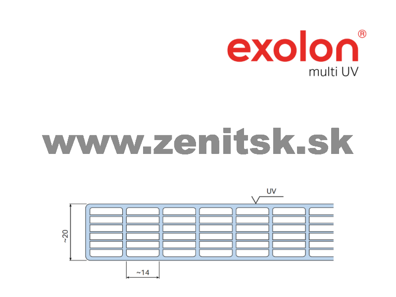 Exolon® multi UV 7/20 BF je sedemstenná polykarbonátová doska o hrúbke 20 mm. Kombinuje výbornú tepelnú izoláciu s vynikajúcou odolnosťou voči poveternostným vplyvom. Doska je ľahká, odolná proti nárazu a ľahko sa inštaluje. Skratka BF znamená "Butterfly" (označenie výrobcu).