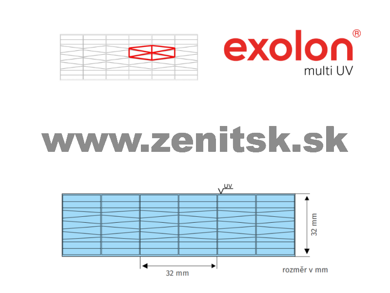 Exolon® HX/32 je viacstenná polykarbonátová doska o hrúbke 32 mm s vnútornou štruktúrou HX (Hybrid-X), ktorá zabezpečuje väčšiu tuhosť. Kombinuje dobrú nosnosť s výbornou tepelnou izoláciou, svetelnou priepustnosťou a vynikajúcou odolnosťou voči poveternostným vplyvom. Doska je ľahká, odolná proti nárazu a ľahko sa inštaluje.