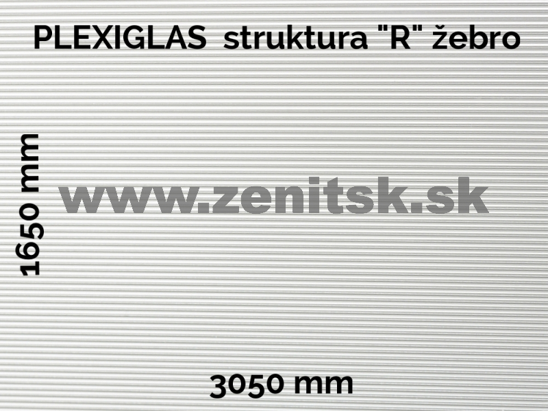Plexisklo dosky so štruktúrovaným povrchom pripomínajúcim malé rebrá, s hrúbkou 3 mm. Materiál vhodný na zasklenie balkónov, deliace priečky, oddeľovanie spŕch, súčasti nábytku, presklenie dverí... Schválené ako bezpečnostné presklenie, výborná odolnosť proti poveternostným vplyvom a proti starnutiu, ľahké a nelámavé, odolné voči nárazu. Jednoduché opracovanie a montáž. Štruktúra je orientovaná tak, že dĺžka rebier je 3050 mm.