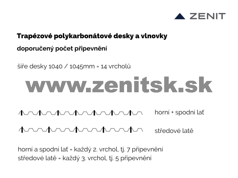 Polykarbonátové trapézové dosky sú veľmi odolné dosky hr. 0,9 mm s UV ochranou na vonkajšej strane a štruktúrou mikroprizma na spodnej strane, ktorá zaisťuje optimálny rozptyl svetla. Sú tak ideálnym materiálom pre zasklenie rôznych prístreškov, pergol, zvislých stien, státí pre autá a pod. Štruktúra dobre láme slnečné lúče a vytvára tak príjemné klima. Hrúbka 0,9 mm zvyšuje tuhosť a únosnosť tohto typu trapézových dosiek.