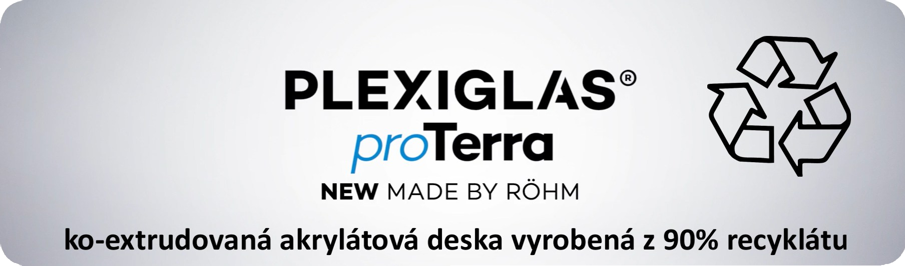 PLEXIGLAS® proTerra je vysoko kvalitný akrylát vyrábaný udržateľným spôsobom; jedná sa o obojstranne koextrudovaný doskový materiál vyrobený z akrylového skla (polymethylmethakrylát, PMMA). Dosky obsahujú cca. 90 % recyklovanej suroviny PLEXIGLAS®. Viac info tu.
