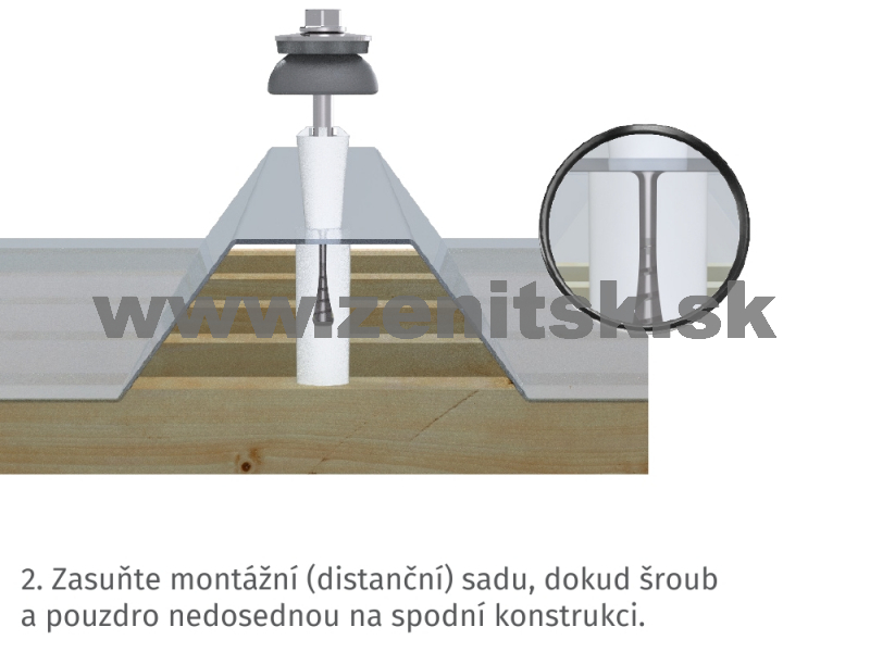 2. Zasuňte montážnu (distančnú) sadu, kým skrutka a puzdro nedosadnú na spodnú konštrukciu.