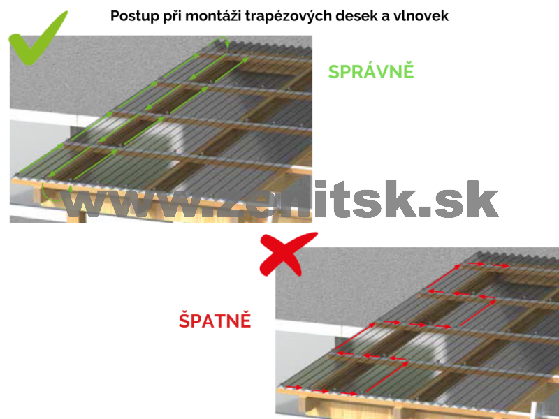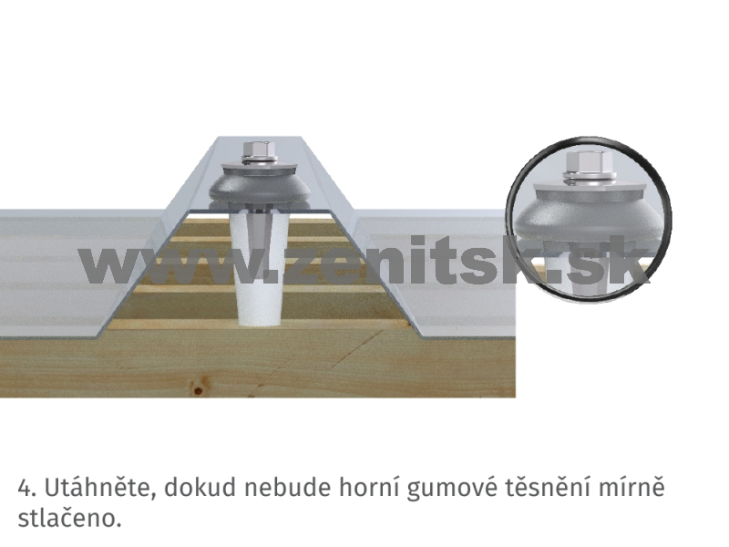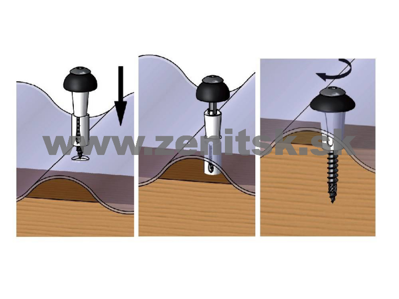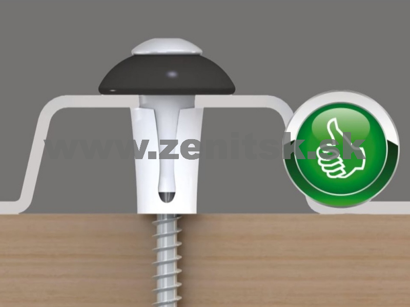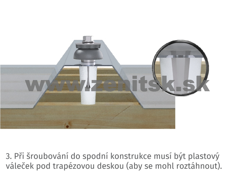 3. Pri skrutkovaní do spodnej konštrukcie musí byť plastový valček pod trapézovou doskou (aby sa mohol roztiahnuť).