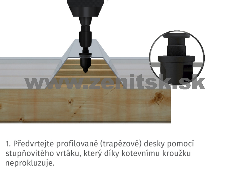1. Predvŕtajte profilované (trapézové) dosky pomocou stupňovitého vrtáka, ktorý vďaka kotevnému krúžku nepreklzáva.