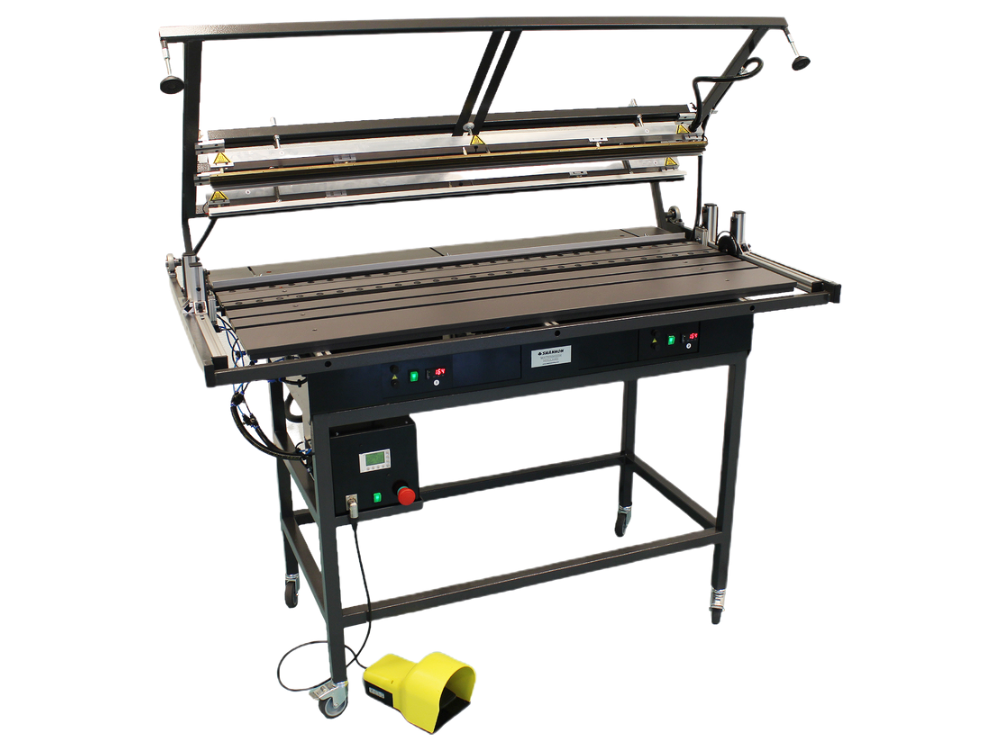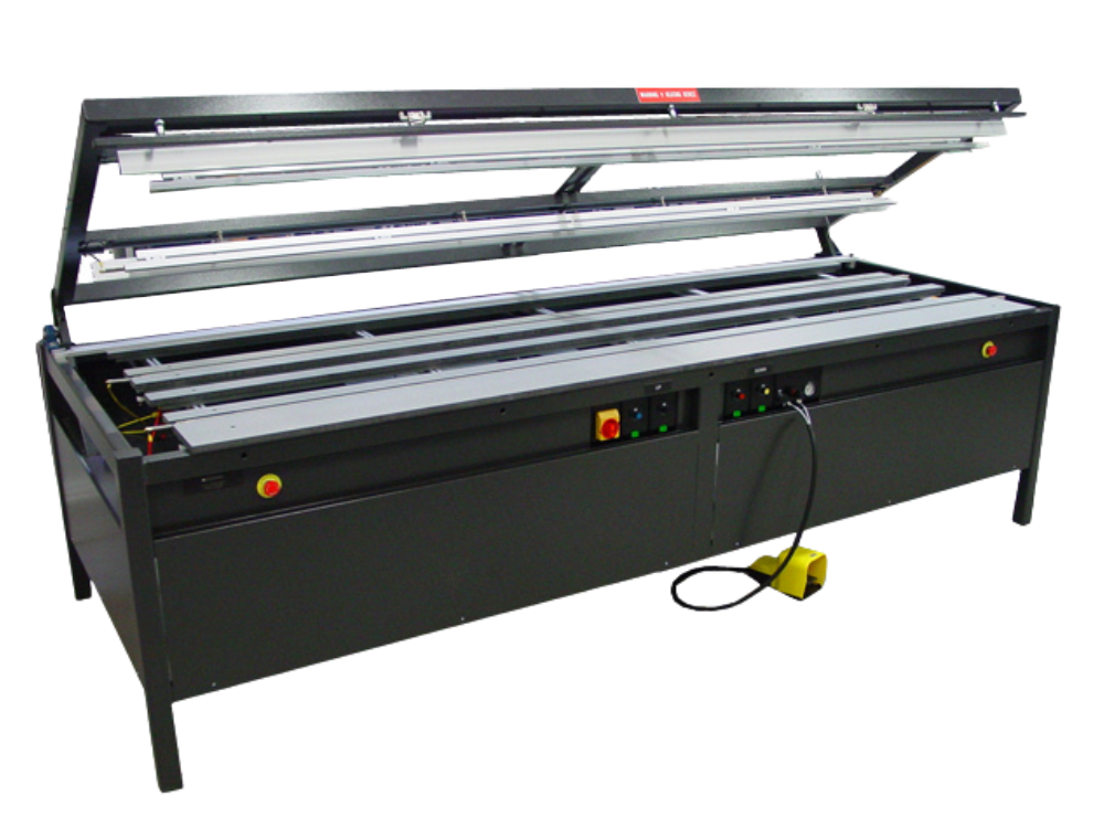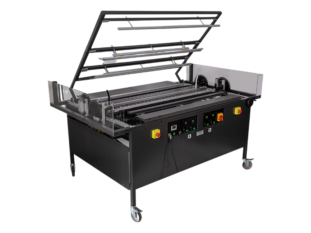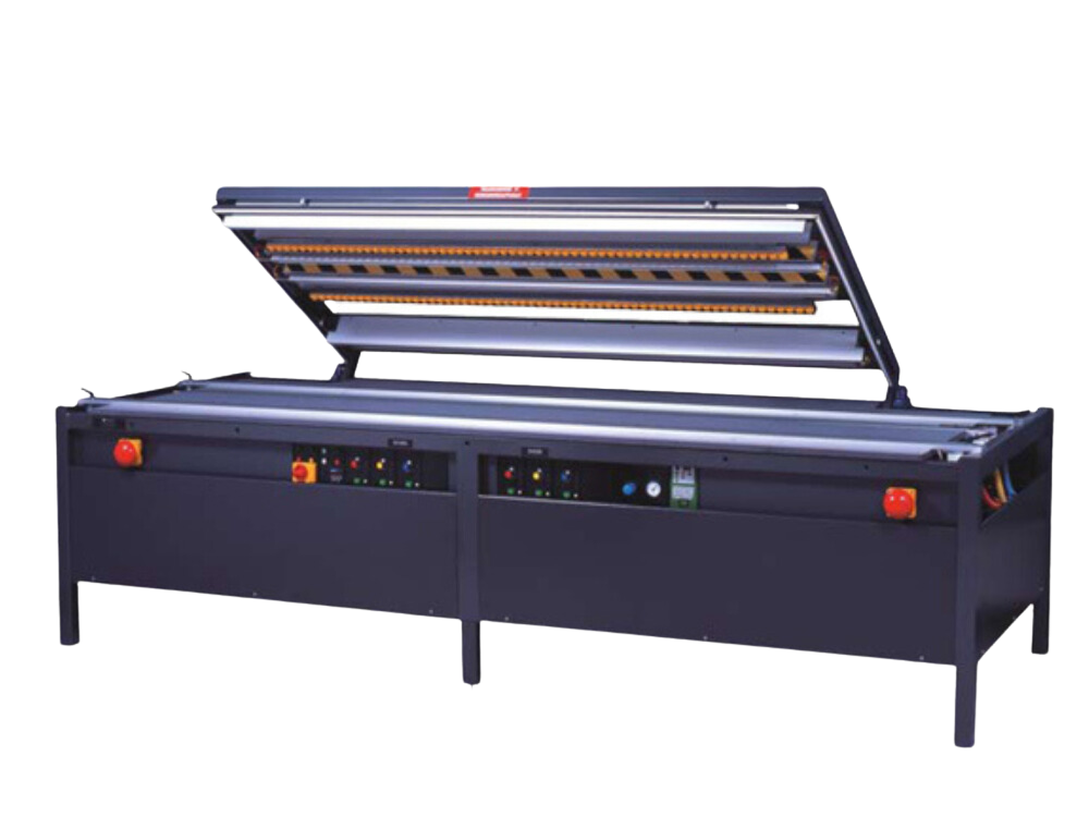 Podlahový model stroja s obojstranným ohrevom, časovo riadeným horným rámom a pracovnou dĺžkou 2200 mm. Vybavené dvoma jednotkami pre reguláciu teploty, dve spodné vykurovacie lišty a dve vykurovacie lišty hore. Štandardne sa dodáva s nastaviteľným referenčným dorazom a dvoma upínacími tyčami.