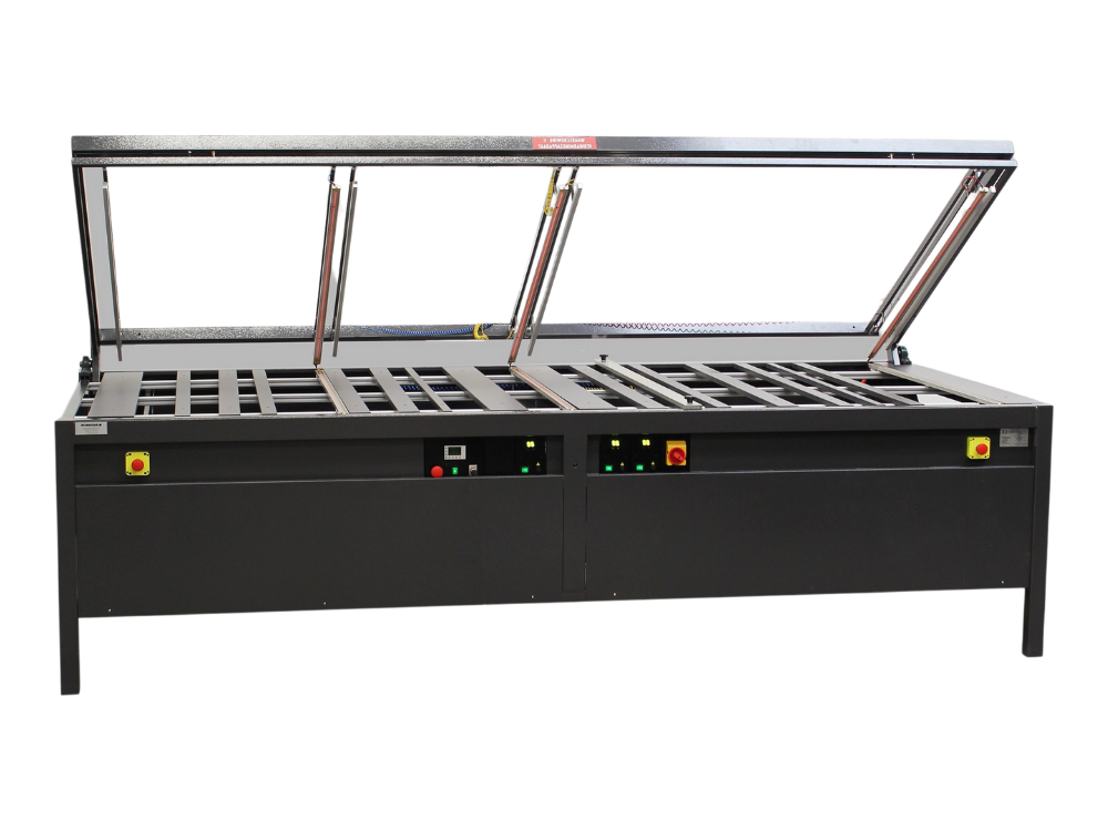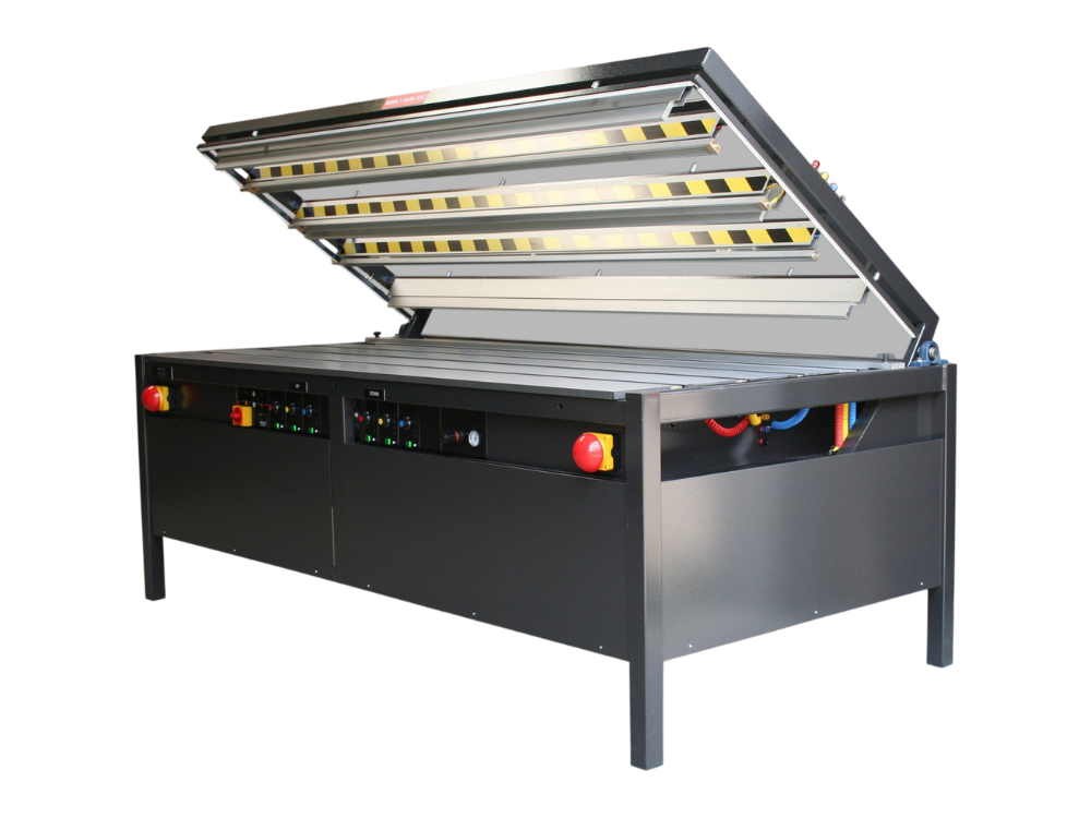 Veľmi produktívna automatická ohýbačka plastových dosiek s pracovnou dĺžkou 3000 mm. Dodáva sa s časovo riadeným horným rámom, automatickým podávaním a systémom dopravného pásu. Až osem teplotných regulátorov pre štyri horné a štyri spodné vykurovacie okruhy, štyri prítlačné prvky.